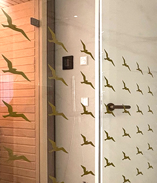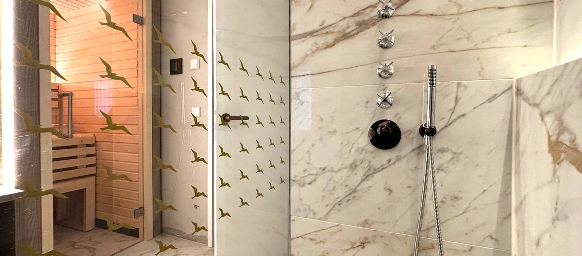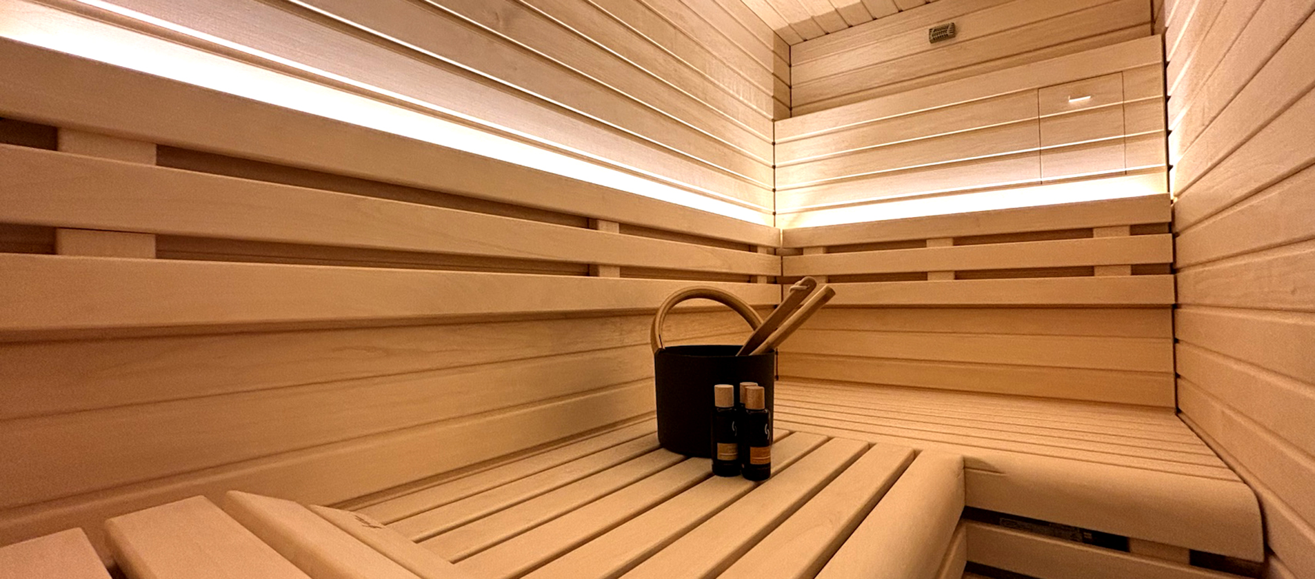 Sauna aus Espenholz im Bad mit ebenerdiger Dusche mit Schwallbrause, separates WC, Haartrockner, Handtuchwärmer
